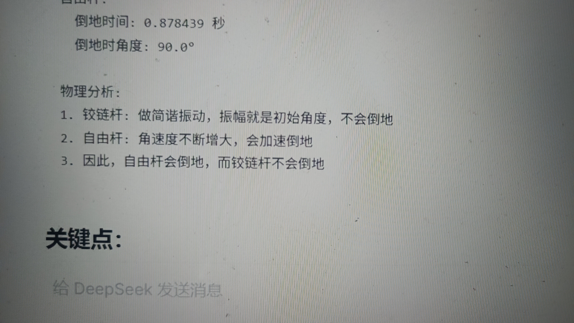 | 初始角度 | 自由杆时间(s) | 铰链杆时间(s) | 时间比(自由/铰链) |